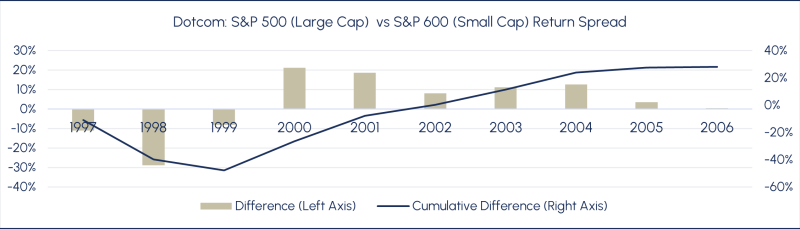 The Dot-Com Parallel: From 1997 to 2000, large-cap growth stocks dramatically outperformed small-cap value stocks. From 2000 to 2006, this trend completely reversed, with small-cap value generating cumulative outperformance exceeding 40%.