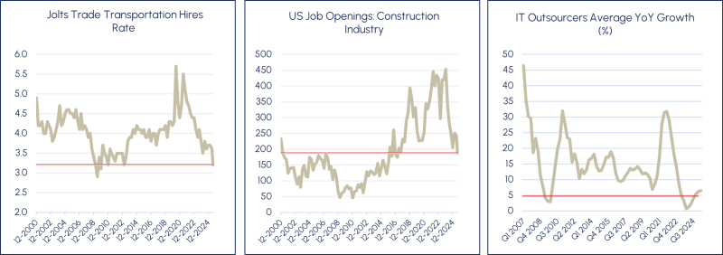 - Transportation: The JOLTS Trade Transportation Hires Rate shows persistent weakness